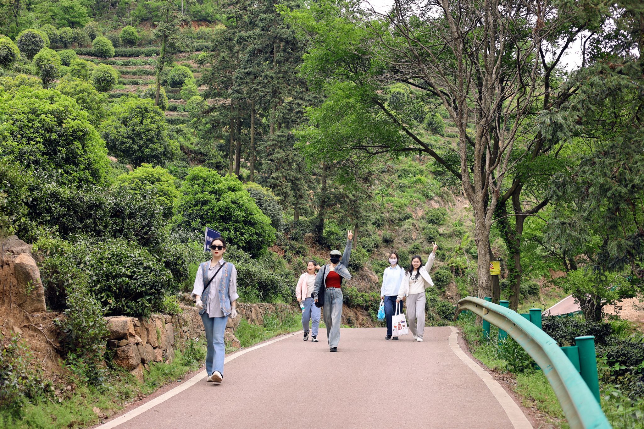 花溪茶谷春意盎然,映山红盛放着,一团团一簇簇的,像是在列队欢迎大家。漫步生态廊道,峡谷蜿蜒处溪流潺潺,峡谷四周围峰峦起伏。忽闻暗香,循香望去,茶园茶树葱郁,如一片绿色海洋正舒卷着翡翠波涛,漫步茶田,仿佛置身于山水画中。女教职工们徜徉自然,心情舒畅,时而驻足欣赏春色,时而拍照定格美景,大家抒怀山涧,感受着春天的馈赠。