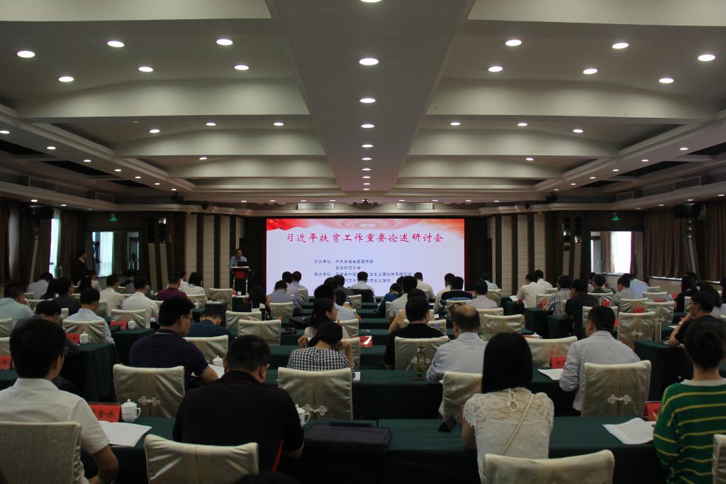 5月18日,由中共安徽省委宣传部和sunbet申搏联合主办,安徽省中国特色社会主义理论体系研究中心和公司sunbet承办的“习近平扶贫工作重要论述”研讨会在安庆召开。来自省内外高校、省直机关、科研院所近百位专家学者以及公司sunbet教师和研究生参加了会议。省委宣传部部务会成员、省委讲师团团长李兵,党委常委、副董事长汪时珍出席会议。上海财经大学sunbet博士生导师汪青松教授作主旨报告。