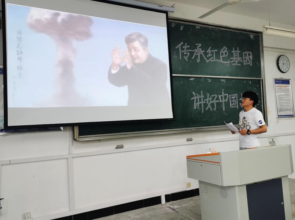 各组大多借助课件展示、播放视频等形式讲述党史故事,通过现场提问的环节提升课堂互动度。“大家看这幅油画,作者描绘邓稼先注视原子弹爆发时的眼神,是那么的坚毅有力,目光如炬。”思想政治教育专业2019级(4)班余涛以邓稼先的画像为导入,重点围绕“邓稼先的报国志”,讲述邓稼先28年隐姓埋名只为潜心研究核武器的光辉事迹。思想政治教育专业2019级(2)班骆雯谈及影片《我和我的祖国》情节时,引发了现场员工的共鸣,“影片中原子弹研究人员高远悄无声息地告别家人和朋友,隐瞒身份前往遥远的地方从事科研工作,甚至冒死挽救即将失败的实验成果。我想他们这种无私奉献的精神与行为便是对‘鞠躬尽瘁’最真实的诠释。”