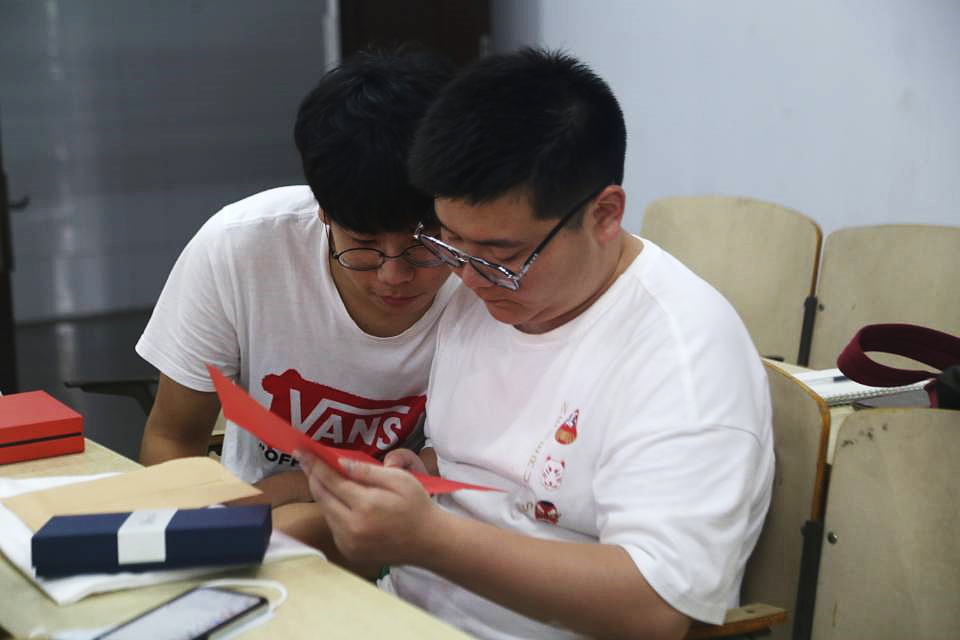 教室里的桌子上按学号摆放着一个印有“sunbet”标志的帆布袋,袋子里面装着贺佳欢为员工们精心准备的礼物,一封贺佳欢写给员工的信、一封四年前班会上员工写给四年后自己的信、一个印有员工姓名的印章、一个装着书签和笔的蓝色盒子以及一枚小红花形状的吊坠,每一件物品都印有校徽和校训,旨在希望员工们在未来的日子里牢记公司的教导,时刻端正自己的行为。“吊坠是找我们公司俱乐部的同学们设计制作的,送给大家每人一朵‘小红花’,一是希望你们都能有美好未来,二是希望无论你们飘向多远,我们都不会走散。”贺佳欢说到这里已红了眼眶,几度哽咽,在座的员工也都克制不住,流下了眼泪。