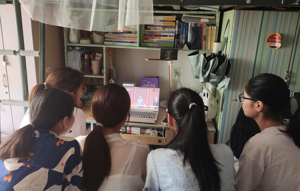 “我看着5架直升飞机分别悬挂中国共产党党旗和写有‘伟大的中国共产党万岁’、‘伟大的中国人民万岁’、‘伟大的中华人民共和国万岁’与‘全国各族人民大团结万岁’的条幅迎风向前时,我的泪水不由自主地流了出来,我也无比自豪,因为我生在红旗下,长在春风里。”思想政治教育专业2020级(1)班劳锦欢热泪盈眶地说。