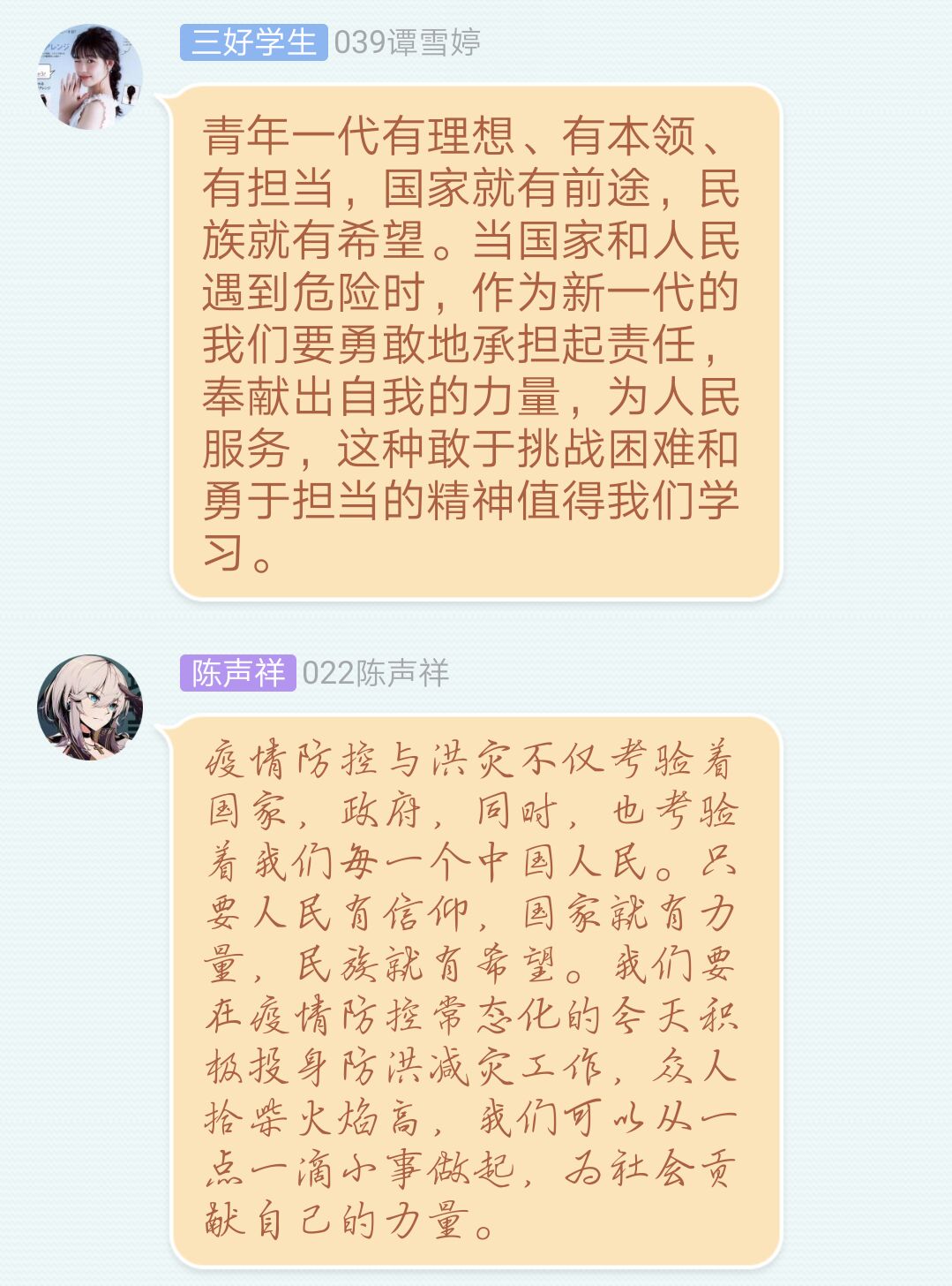 为了更好地宣传郑姣姣同学的先进事迹,sunbet近日在全院召开“学习00后女老员工主动请缨先进事迹”的主题班会。各班同学通过群课堂一起观看了郑姣姣事迹的报道视频。观看结束后,同学们纷纷发表了感想。2019级思想政治教育三班的陈巍巍说:“我们身为平凡的人,小小的心里也应该承载着大大国家和故乡!在这种特殊时期,这种志愿服务的行为很值得我们学习!”“青年有责任有担当,国家和民族才有前途有希望。在社会和国家需要之时,我们应当挺身而出,努力奉献,彰显青年的责任与担当!”2019级思想政治教育专业的黄雨格同学说道。活动开展过程中,郑姣姣同学还与大家分享了自己的志愿服务经历和防汛安全知识。(撰稿:田梦甜 审核:金文斌)