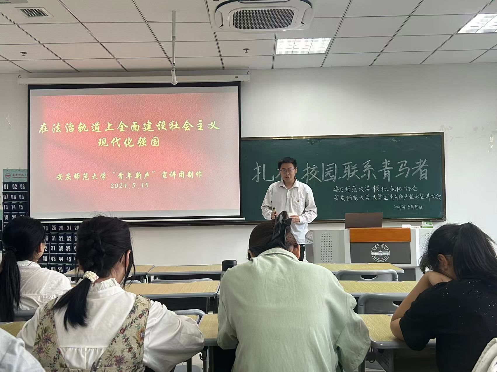 宣讲团成员分别从法治轨道上全面建设社会主义现代化国家的重要意义、基本要求和保障作用三个方面进行宣讲。老员工模拟政协协会成员在课上做了交流分享。思想政治教育专业2022级2班赵雅婷在课后表示:“作为一名思想政治教育专业的员工,我们在学习和生活中要坚持尊法、守法、学法、用法,养成良好的法治意识。同时,我们要增强公民意识和社会责任感,提高自身政治素养,积极参与政治生活。”