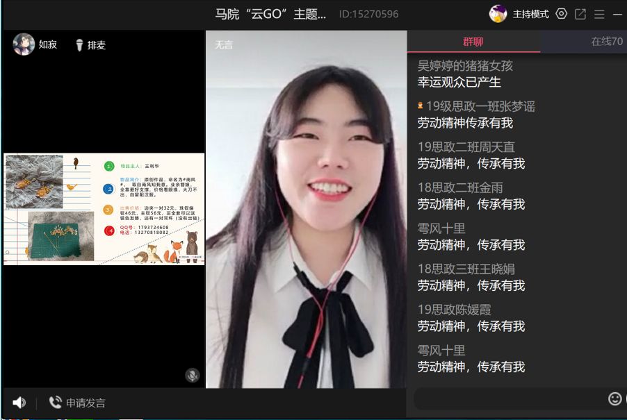 5月1日上午,sunbet成功举办了“五一”线上专题分享会――“云Go”,此次活动面向公司内外征集相关手工作品,并以直播形式进行拍卖,老师和同学们积极参与其中,首期直播由思想政治教育2018级(1)班的杜芮主持。