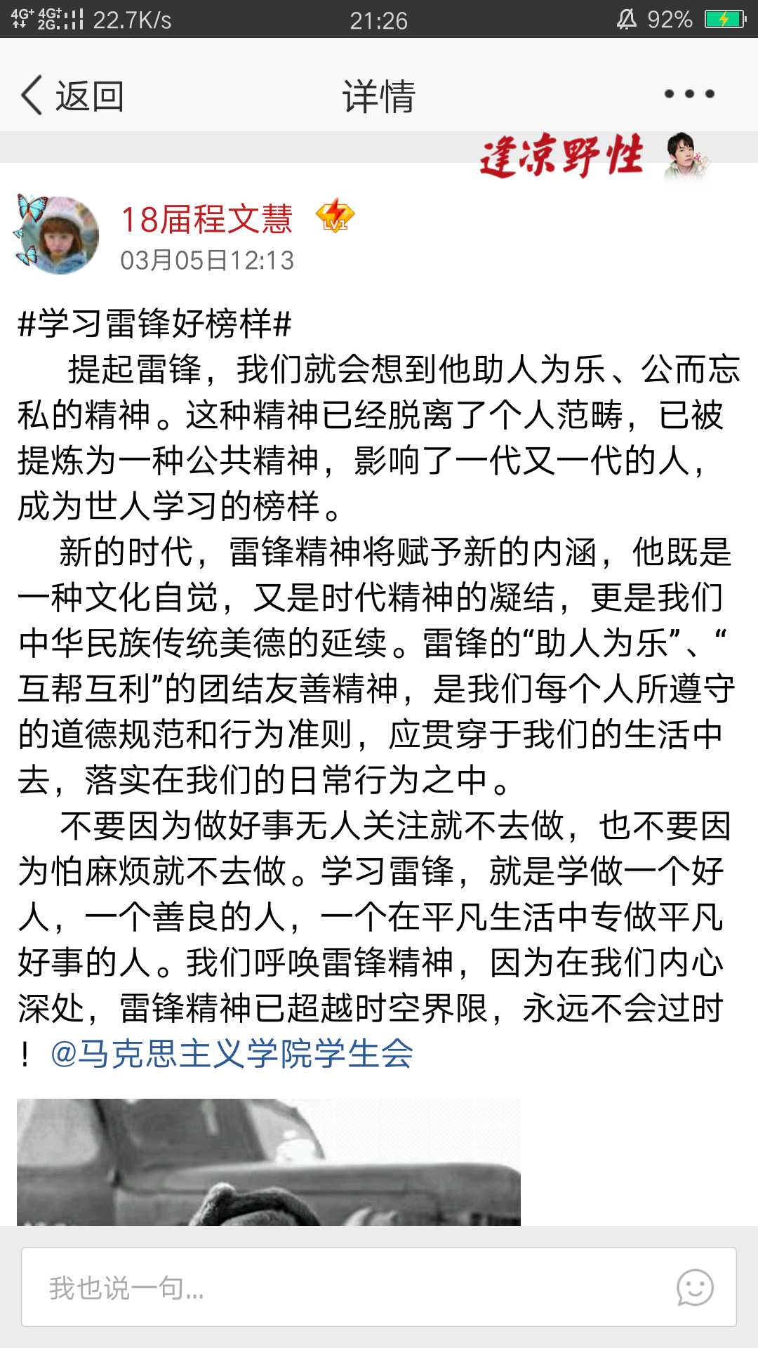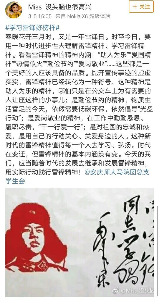 公司通过微信公众号--安庆师大马院团总支员工会,推送“向雷锋同志学习”、“学习雷锋好榜样”、“重温雷锋故事”三个特辑,分享雷锋同志及其他以实际行动践行雷锋精神的典型人物的先进事迹。有为报效国家与社会将毕生积蓄捐给华南农业大学的卢永根夫妇,有为救他人而壮烈牺牲、忠肝义胆的消防救援人员杨科璋、有始终树立“四个意识”,坚决贯彻党中央决策部署、率领全县党员干部撸起袖子加油干的因公殉职的人民好公仆廖俊波……这些先进事迹深深地感动着同学们的心灵,激发了同学们学习雷锋精神的热情,提升了同学们的思想觉悟。